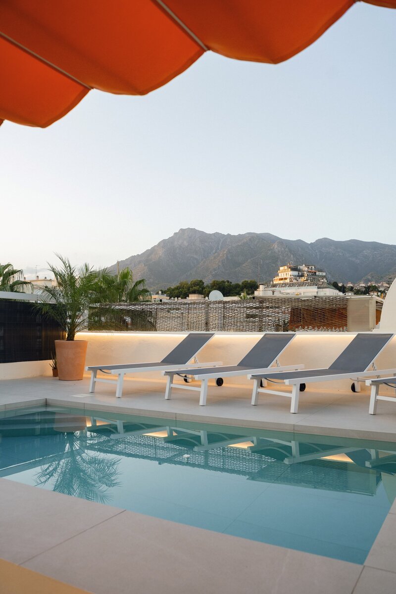 The highlight is the private rooftop terrace, complete with a sleek pool, dining and lounge area and panoramic views of La Concha and the city. It’s the perfect setting for slow mornings, sunset dinners and evenings with friends under the Marbella sky.